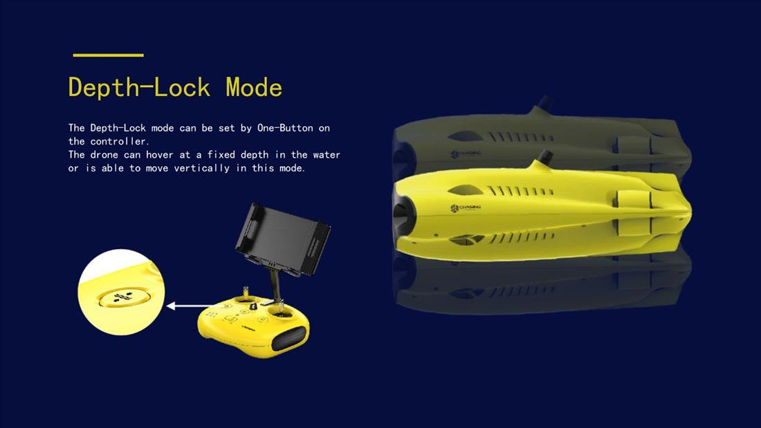Når man fører undervannsdronen via skjermbildet kan det til tider være vanskelig å ha 100% perspektiv på dybden. I displayet vises selvsagt dybden, men hvis du vil låse deg til et bestemt nivå har du en egen bryter for dette. Undervannsdronen vil så holde konstant dybde. Selv i dette moduset kan du bruke stikkene for å bevege modellen vertikalt og låse den på ny dybde.