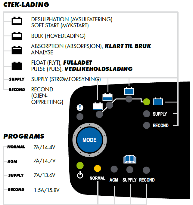 - Lader batterier mellom 14-150Ah og opptil 225Ah for vedlikeholdslading