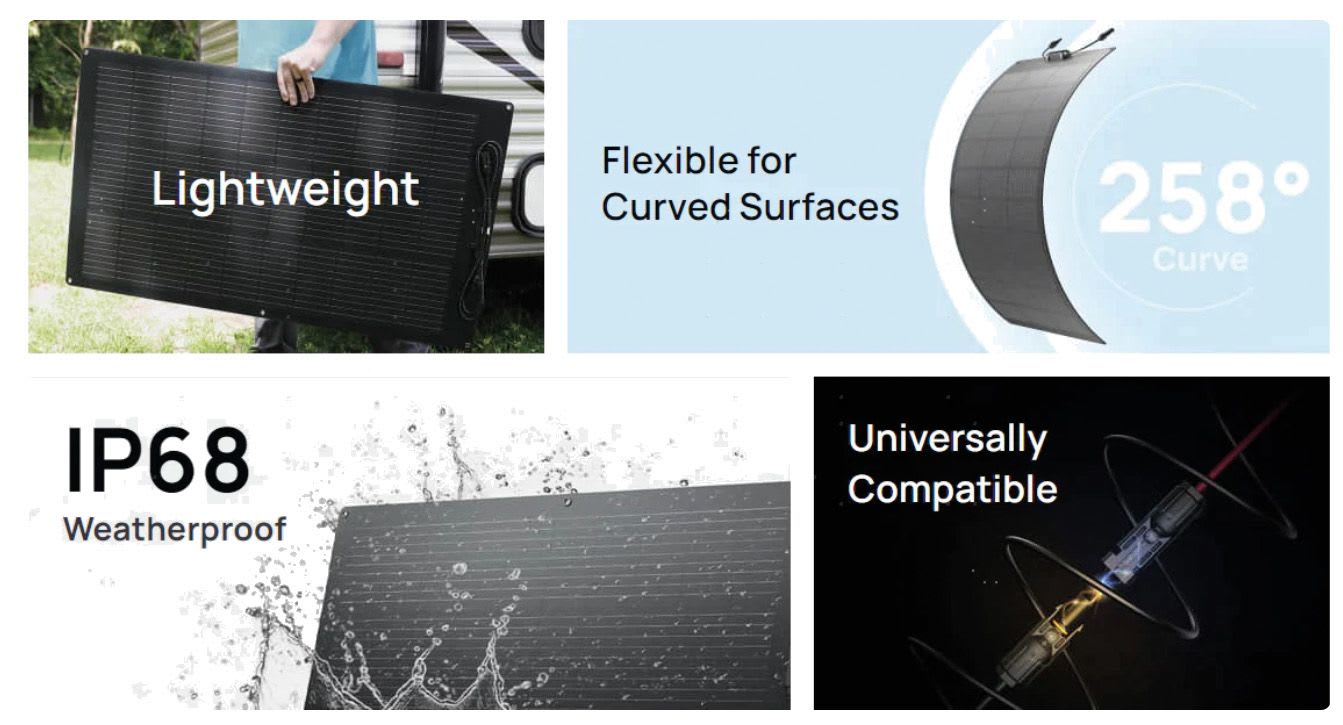 100W fleksibelt solcellepanel har en utmerket effektivitetsgrad på 23 %, slik at du kan lade enda raskere. Panelets integrerte bypass-dioder forhindrer overoppheting samtidig som celleytelsen opprettholdes selv i skyggefulle omgivelser. Perfekt sammen med EcoFlow Delta og River kraftstasjoner. Kan også tilkobles andre solcelleanlegg.