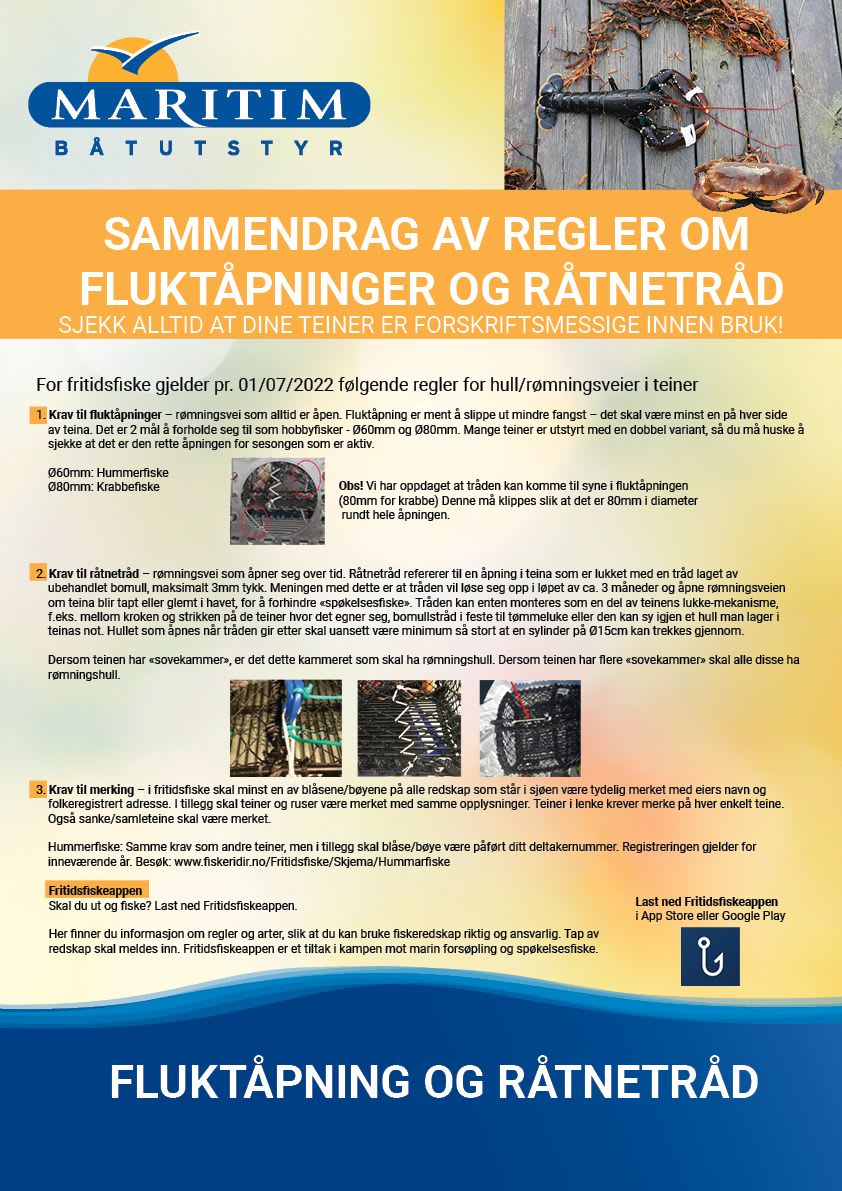 Som båteier er det avgjørende å forstå og følge reglene for fluktåpning i teiner. Dette fremmer bærekraftig fiskepraksis og bidrar til å opprettholde sunne hummer- og krabbebestander. Ved å implementere riktige fluktåpninger, tar du et skritt mot å beskytte fremtiden for fiskeri og miljø. Husk å konsultere lokale myndigheter og eksperter for å sikre at du følger korrekte retningslinjer.