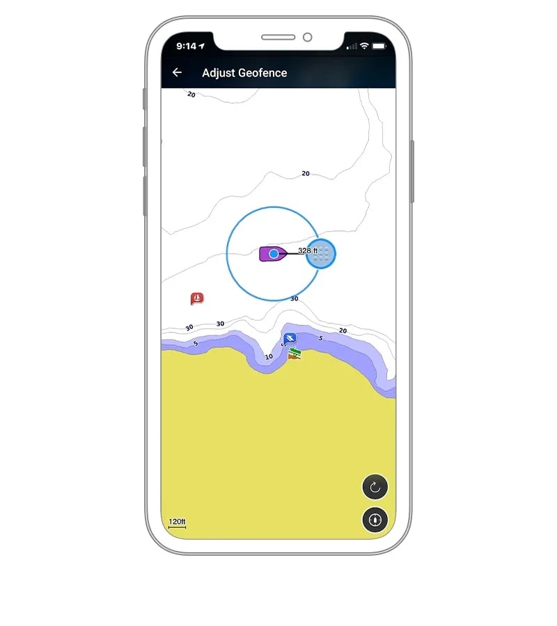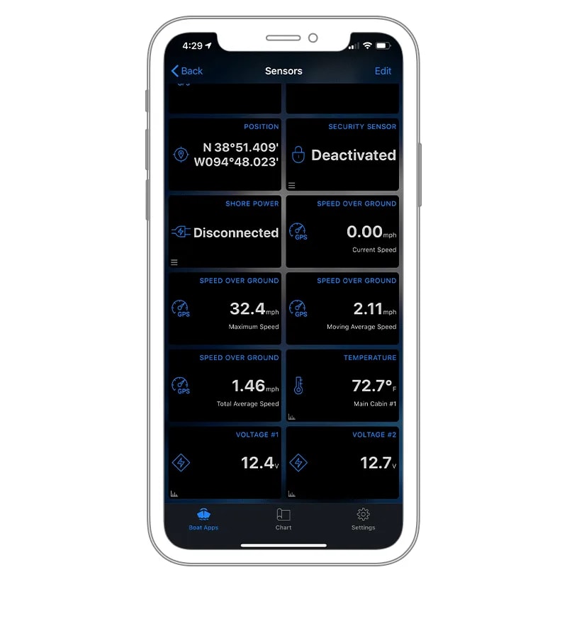 Bli den første som får vite om en sikkerhetssensor har blitt utløst eller om båten har flyttet på seg. Den interne GPS-sensoren oppdateres hvert 15. eller 30. minutt, avhengig av strømstatusen, og sender deg tekstvarsler1 dersom båten forlater det geoinngjerdede området