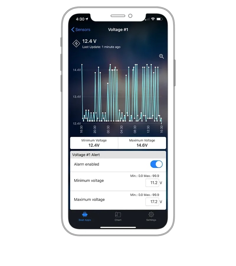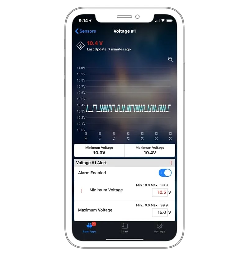 Få oppdateringer1 om båtens batteristatus, lenseaktivitet, landstrøm, temperaturendringer og mye annet. Konfigurer alarmvarsler i ActiveCaptain-appen