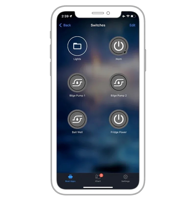 Ta kommandoen over båten din. Fjernstyr opptil fem relébrytere for kritiske systemer om bord via OnDeck-huben og ActiveCaptain-appen, inkludert batteriladere, ismaskiner med mer. Du kan også kontrollere så mange brytere du trenger, med støtte for midlertidige eller vedvarende NMEA 2000-brytere via digital EmpirBus-regulering eller andre tredjepartsgrensesnitt