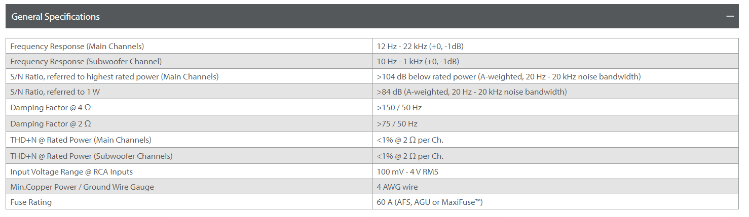 - 100W x 2 + 400W x 1 @ 2ohm / 75W x 2 + 250W x 1 @ 4ohm. 14,4V.