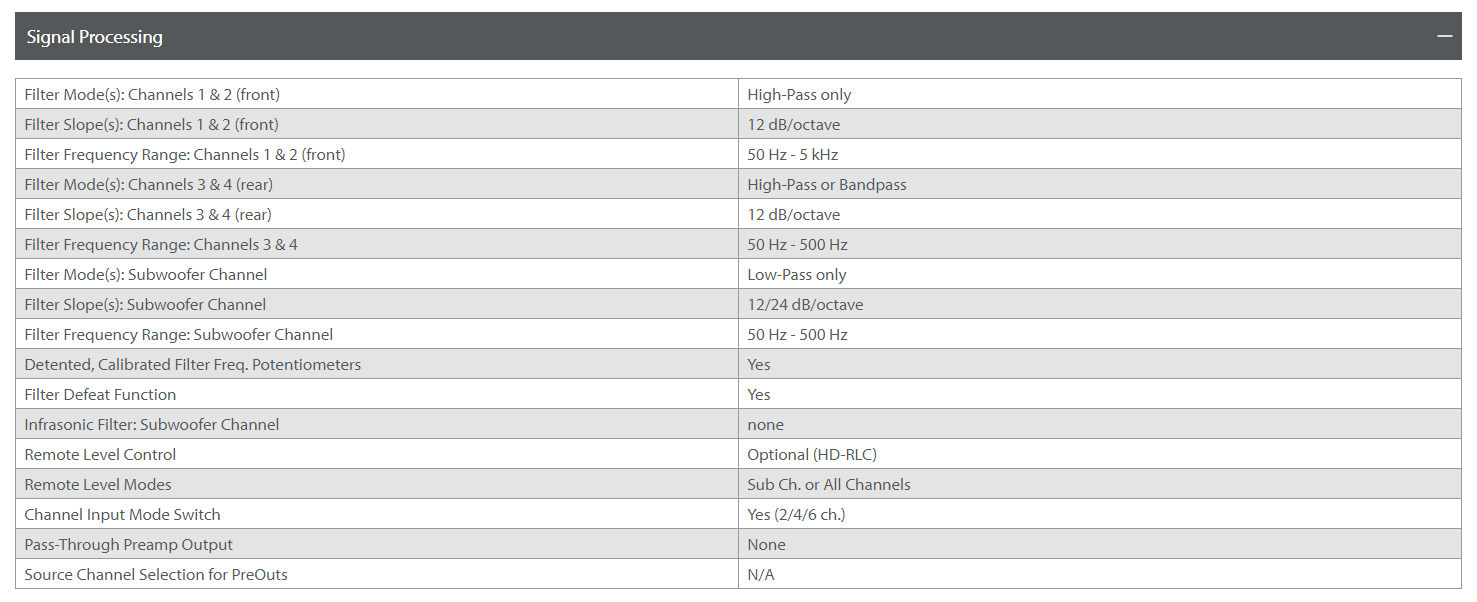 Inkluderer et 12dB/oktav highpass passering på hovedkanalene og en dedikert 24dB/oktav lowpass overgang for subwooferkanalen.