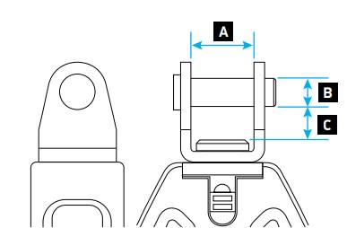 Det vridbare hodet på blokken passer på tappene som normalt finnes i mastefoten. Sjekk diameter på tappen mot bredden på blokkens kjeft (A) og låsepinnens diameter (B).