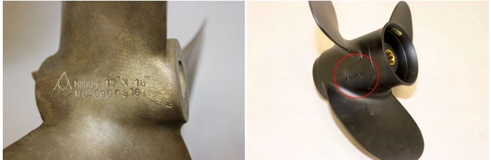 Størrelsen angis alltid med diameter først, deretter stigning. Du finner som oftest målene mellom propellbladene eller på enden av navet: Eksempel 14 ¼ x 12.