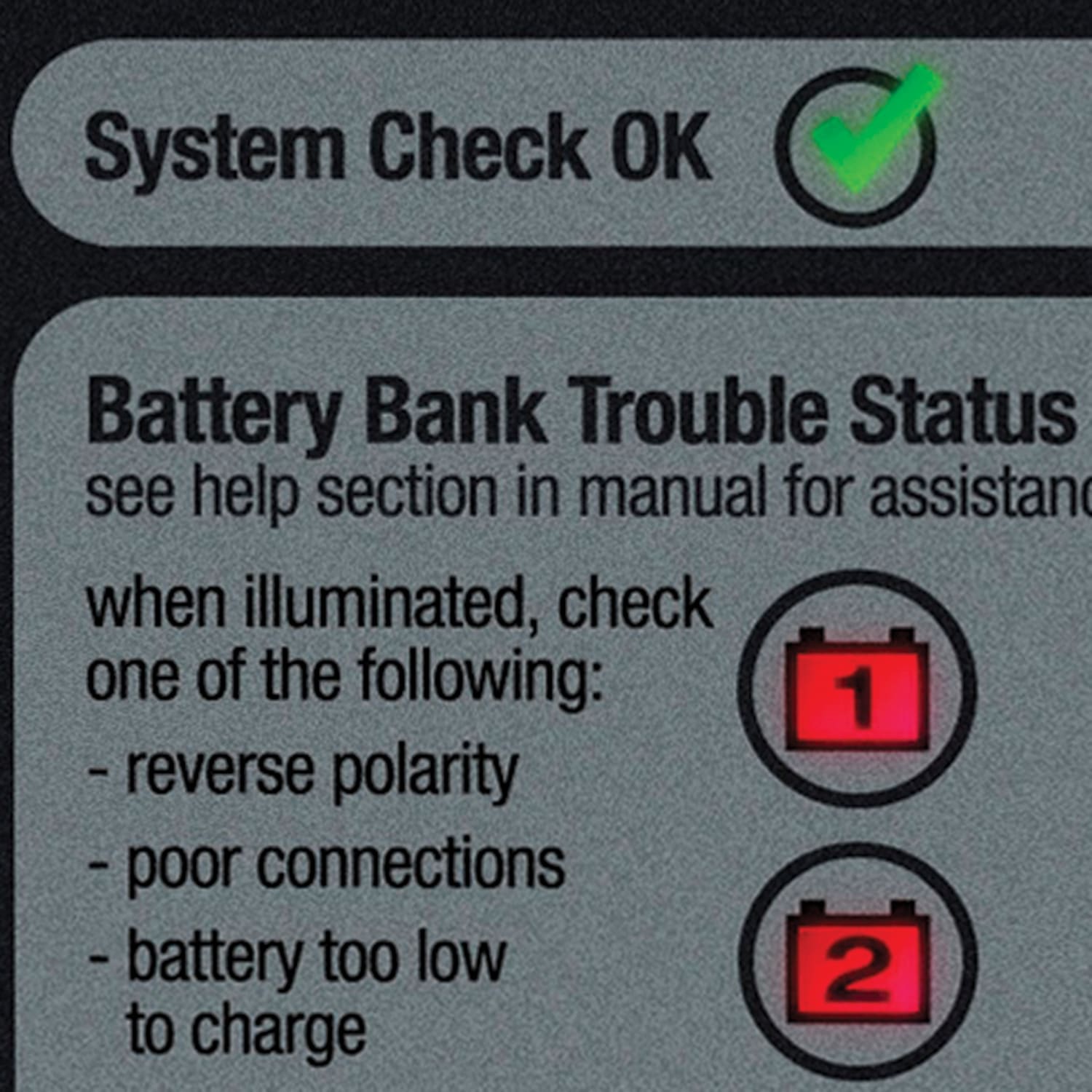 - Steg 1: Systemsjekk og batterianalyse. Gir automatisk tilbakemelding om installasjon er ok og eventuelle feil på batteribankene med sine «System Check Ok» og «Battery Bank Trouble» LED indikatorer.