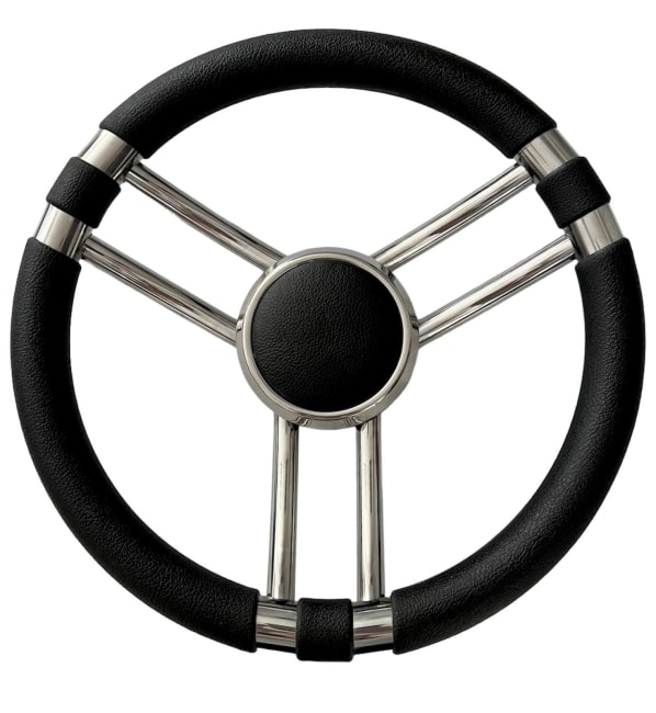 Savoretti ratt i syrefast med sort polyuretan grep og senterkopp med sort skinn.