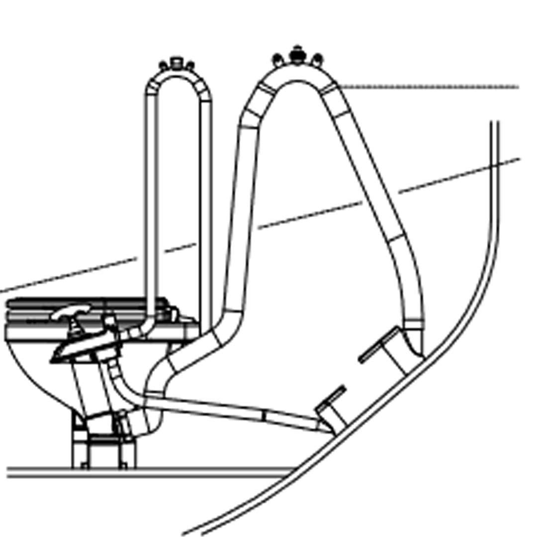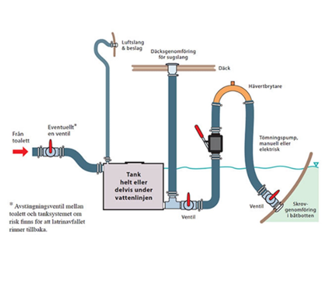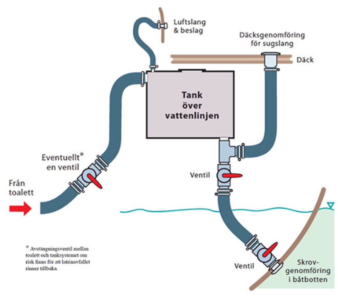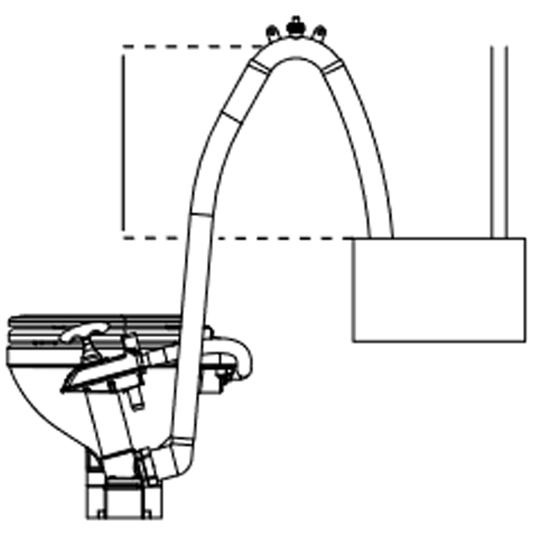 Antihevert: Hvis toalettkanten noen gang er mindre enn 20 cm over den høyeste mulige vannoverflaten (under alle forhold av krengning, lasting eller trimming) og er koblet til en aller annen skroggjennomføringskobling må korrekt plasserte og ventilerte/luftede sløyfer (antihevert) monteres ved inntaks- (hvis koblet til sjøvann) eller utløpsslangene for å hindre eventuelt tilbakeslag av sjøvann inn i båten. Ventilerte sløyfer må være utstyrt med en intern tilbakeslagsventil som slipper luft inn i slangen for hindre hevertfunksjon. OBS: Hvis du ikke gjør dette kan det føre til oversvømmelse.