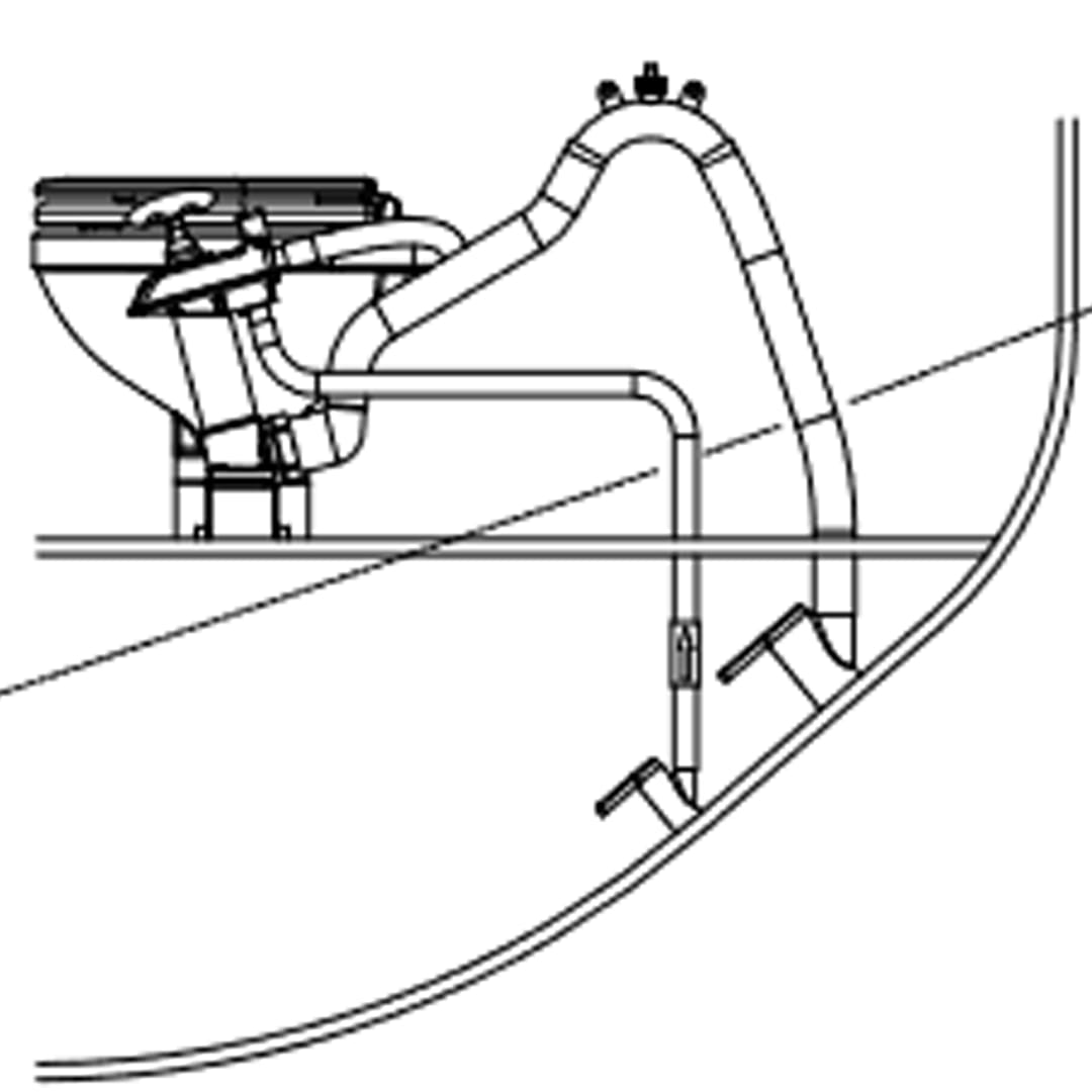 Tilkoblinger gjennom skrog: Du trenger en skroggjennomføring, en kuleventil og 19mm slangestusser for spylevannsinntaket og en skroggjennomføring, kuleventil og slangestusser 25mm eller 38 mm for utløpet (ved tømming i sjøen). Begge kranene må monteres slik at de alltid befinner seg under vannlinjen selv når båten er i bevegelse. Viktig! Bruk kun gasstette septikslanger og to rustfrie slangeklemmer på alle koblinger.