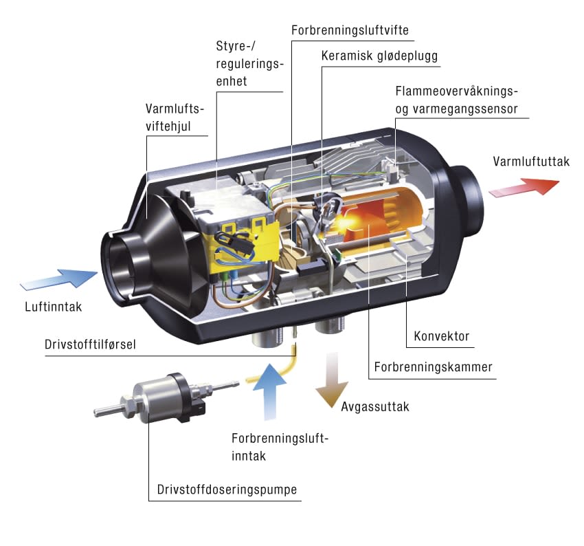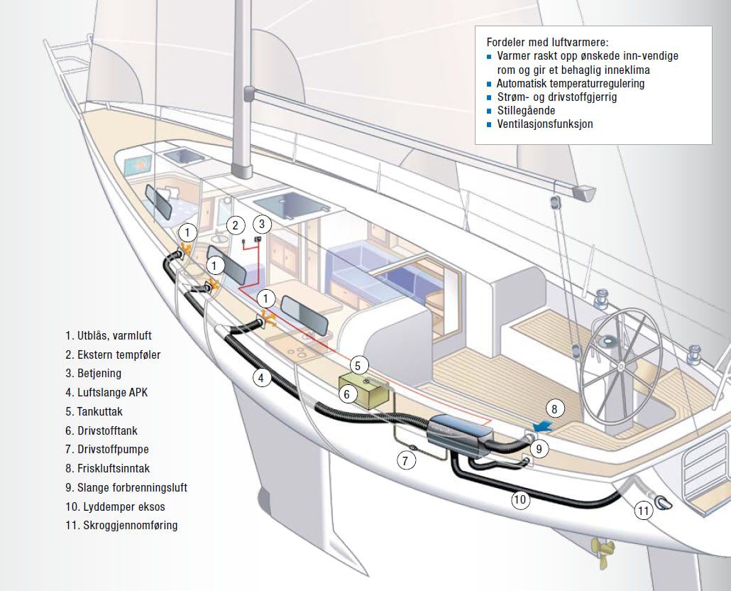 Varmeren drives av drivstoff fra båtens egen tank eller en separat drivstofftank. Viften suger inn frisk luft som varmes opp og fordeles til ønskede rom. Luftvarmesystemet er svært effektivt. Det er både strøm- og drivstoffgjerrig, samt stillegående. Det varmer raskt opp rom og gir et behagelig inneklima. På varme dager kan man benytte viften til ventilasjon.