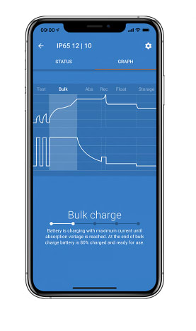 Med Bluetooth og VictronConnect app kan du overvåke og sjekke status på lader og batteri samt endre innstillinger på lader via mobiltelefon eller laptop.