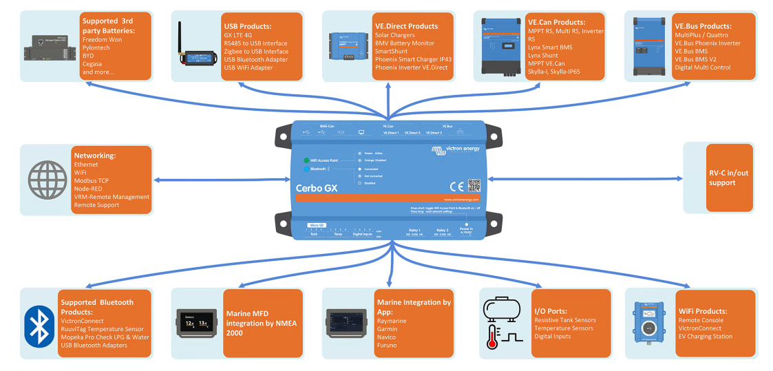 Victron Cerbo GX lar deg kontroll over eksterne systemer med sanntidsovervåking, historisk analyse, fjerntilgang og kontroll med Victron Remote Monitoring (VRM)-portalen, VictronConnect-appen eller koble til GX Touch 50 skjermen (ekstrautstyr) for direkte kontroll. Kan integreres med kartplottere via NMEA 2000.